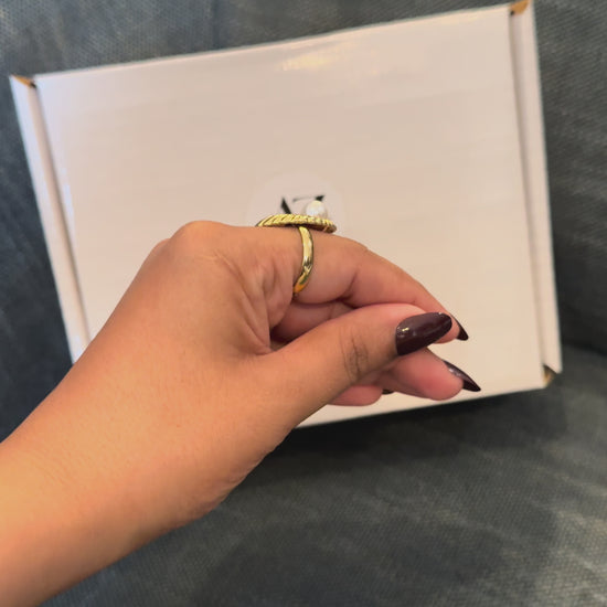Crafted in stainless steel with 18k gold plating, the Nargis Ring is adjustable for everyday comfort. Its sculptural lines and luminous pearl create a perfect balance of boldness and delicacy, much like Nargis herself, who redefined cinema with her talent and poise.